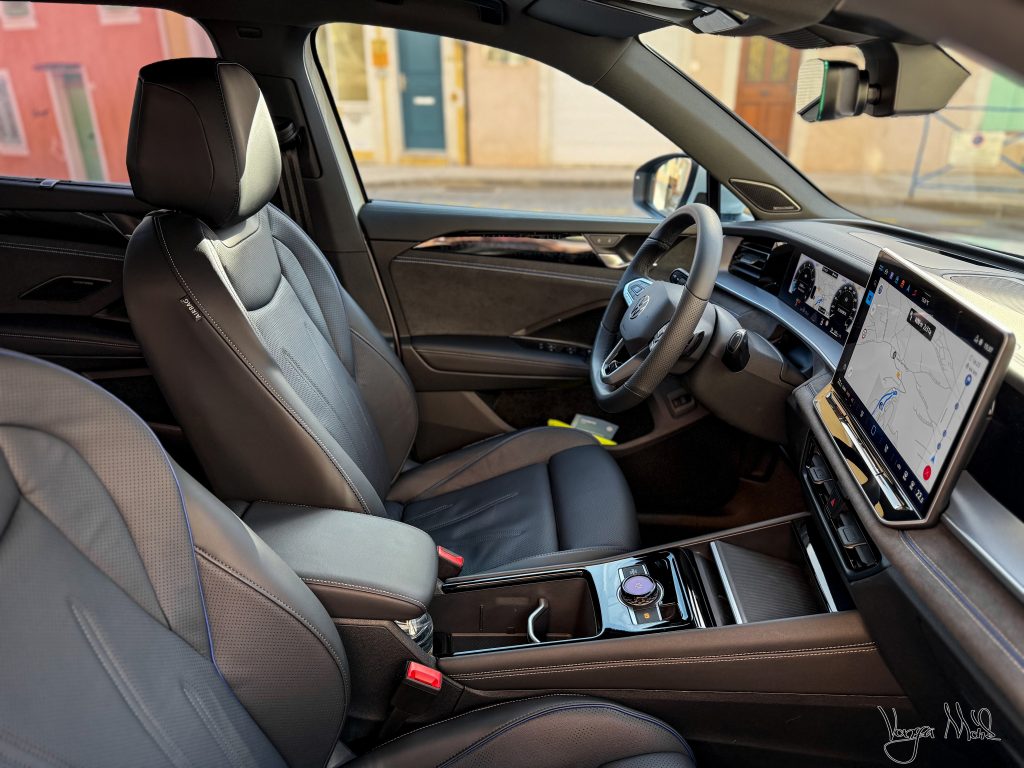 Az utastérben a műszerfalat és az ajtókat végig varrott műbőr, vagy alkantara borítás díszíti, egyes modelleknél valódi fa dekorelemek is megjelennek, de sajnos a fényes fekete „zongoralakk” felületekkel még mindig nem szakított teljesen a VW, bár a mennyisége csökken. Természetesen vannak keményebb felületek is, de jellemzően nem olyan helyen, ahol tényleg számít. A prémium belsőtér kialakítására való törekvés kétségtelen és jól is sikerült. Érdekes volt látni, hogy a gyár mérnökei miket tartottak fontosnak: kiemelték például az autó prezentációja során, hogy újra fizikai gombok kerültek a kormányra. Külső szemlélőként nem is sejtik sokan, hogy mennyire fontos apróság ez: egy ideig ugyanis a VW csoport modelljei rendre kapacitív érintőgombokat kaptak a kormányon is, ami nem csak zavaró, de időnként akár veszélyes is volt, hisz nézni kellett, hogy mikor mit nyomunk meg. Én ilyen gombokkal szerelt modelleknél rendszeresen kapcsolom be véletlen a kormányfűtést kanyarodás közben. De ezzel szakítottak: hallgattak a visszajelzésekre és újra hagyományos gombok sorakoznak a kormányon. Hurrá! A következő lépcső lehetne egy rendes tolatókamera – a mostani ugyanis a többi VW csoportos modellhez hasonlóan – még mindig botrányos minőségű, ám erre is kaptunk ígéretet: a következő évtől fokozatosan érkeznek a jobb minőségű kamerák. Alig várjuk!