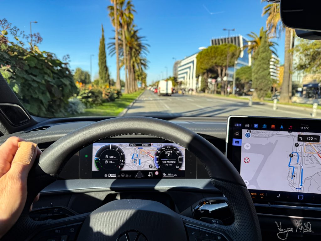 A Tayron a kifutó Tiguan Allspace helyét hívatott betölteni a palettán, ám ahogy az szokás, annál nagyobb méreteket öltött és kategóriában is kicsit fentebb került. Hosszában kb. 10 cm-rel marad el a Touaregtől és kb. ugyanennyivel nagyobb a Tiguannál. Az autóba beülve azonnal érződik, hogy melyik modell volt a referencia: itt nem az előző Tiguan feltupírozott testvéréről van szó. A Tayron szinte minden ízében a nagy, prémium terepjáróra (a Touaregre) igyekszik hasonlítani, amihez sokkal közelebb is került, mint az elődmodell. Igazán tágas belsőteret kapunk, nagy, komfortos fotelokkal, széles és tágas lábtérrel elől-hátul, prémium hatású műszerfallal, remek hifivel, óriási csomagtérrel és csendesszoba szintű zajszigeteléssel. A gyártó állítása szerint 4dB-lel csökkentették a menetzaj szintjét a jobb hangszigetelésnek és az új 3 rétegű zajvédő üvegezésnek köszönhetően. Ezen állítást pedig nehezen tudom kétségbe vonni, ugyanis éjfélkor a kertvárosi nappalimban sincs nagyobb csend, mint a Tayronban a nizzai reptér felé gurulva az autópályán 115-tel. Na jó… azért mégis, de tényleg meglepően csendes volt az autó: a fenti helyzetben 59-60dB zajszintet mértem az autópályán.