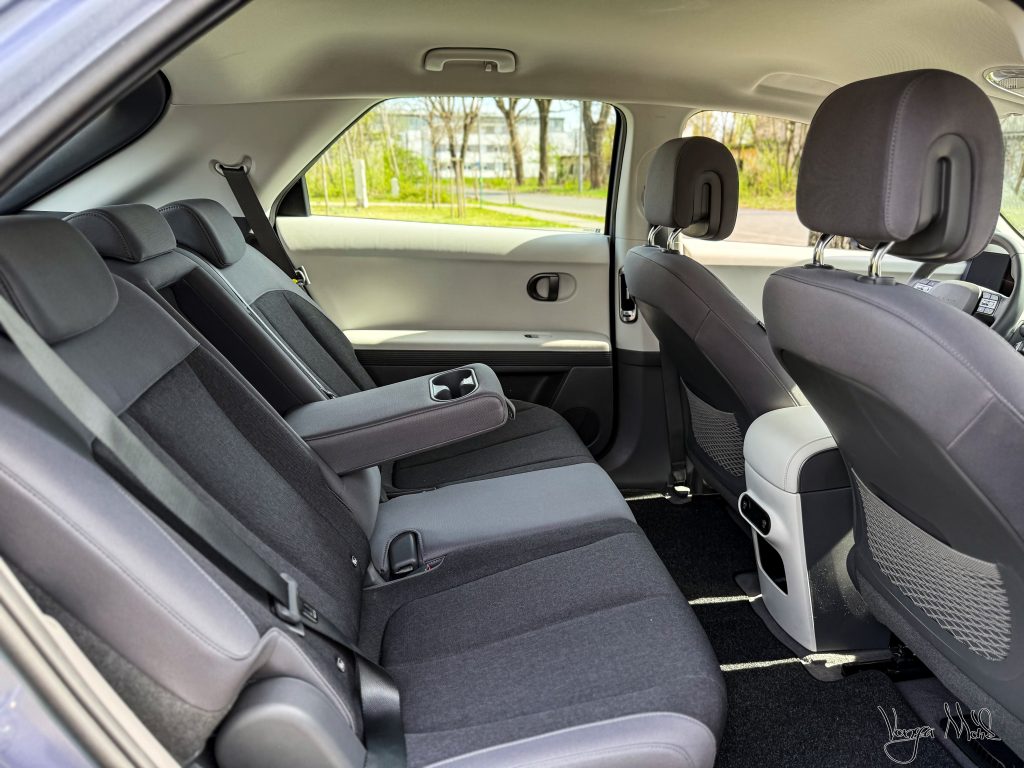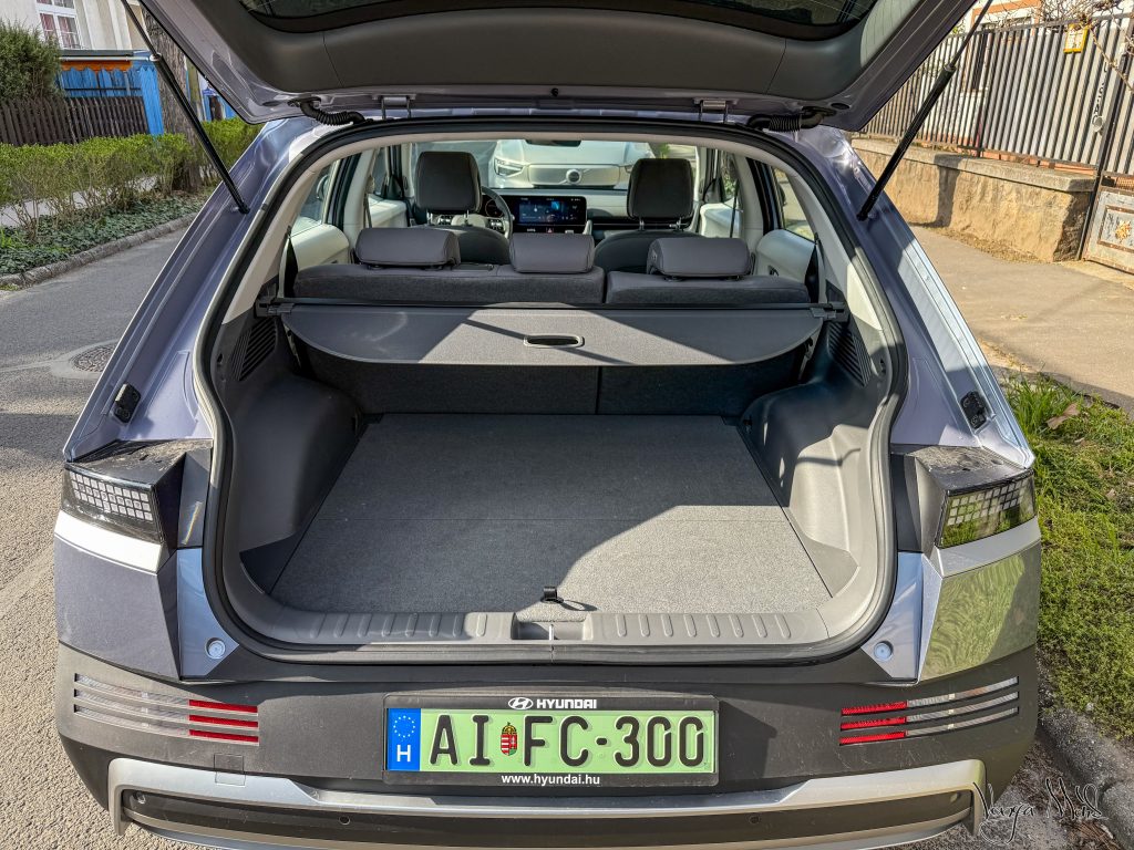 Ami az autó kontúrjait illeti, első blikkre – főleg fényképeken – az ember egy klasszikus hatchback / ferde hátú avagy VW Golf formát lát, ám az ott megszokottnál 40-50cm-rel hosszabb és kb 20cm-rel magasabb az Ioniq 5. Ez tulajdonképpen egy csapotthátúnak álcázott crossover. A hátsó ajtók akkorák, mint egy hosszított 7-es BMW-n, a lábtere láttán pedig az e téren edzett Skoda Superb tulajdonosok szeméből is kicsordul a könny. Amikor beülünk az autóba, a tágas tér és a világos burkolatoknak köszönhetően rendkívül szellős, légies hatás fogad bennünket. A tér igazán nagy lett, de az ablakok mérete, a világos tető, az ajtók és ülések mind-mind növelik a térérzetet. A hátsó üléssor állítható háttámlájú, aminek köszönhetően akár félig fekve is utazhatunk. De lehetőség van az üléseket külön-külön is előre-hátra is mozgatni, amivel érdemben tudjuk növelni a csomagtér méretét is úgy, hogy még mindig marad elegendő lábterünk hátul. Én kb. 10cm-vel húztam előrébb úgy a hátsó üléssort, hogy még mindig nem ért hozzá a térdem a vezetőüléshez, ami rám volt állítva (én 184cm magas vagyok). Ezzel pedig +10cm-nyi rakodótér nyílt a csomagérben. A csomagtér rendben van, de nem óriási – kicsivel 500 liter felett van – ám az ülések mozgatásával tudunk ezen növelni. Elől is kapunk egy plusz tárolót (frunk) a „géptető” alatt ami a hátsókerék hajtású modell esetén 57 literes, az összkerekes esetén pedig 24 liter.