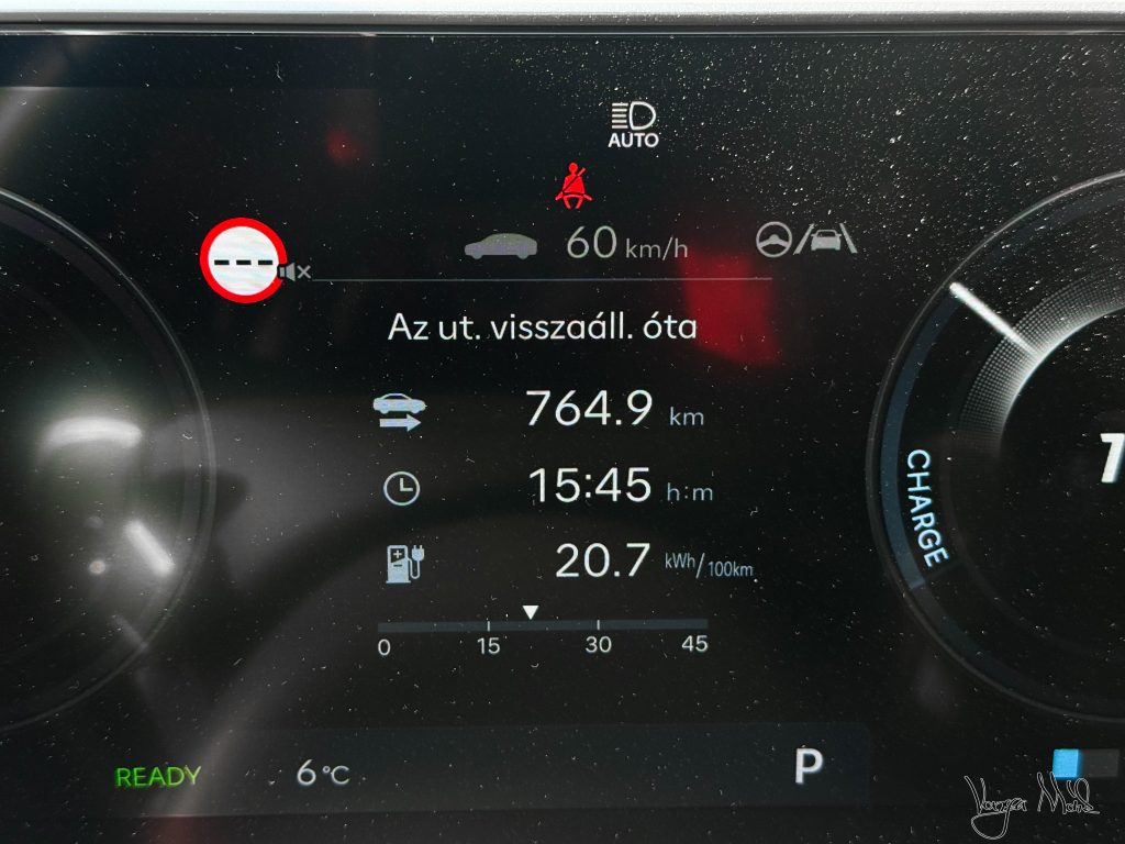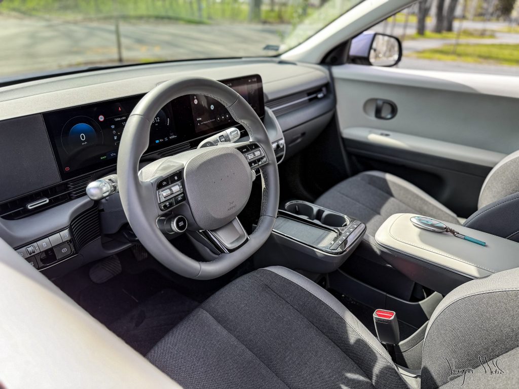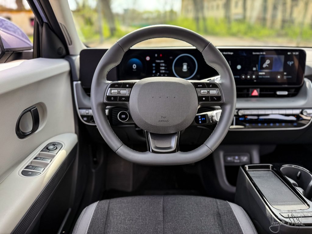 Szerencsére zongoralakk kevés van ma már az utastérben, a beltér összhatása harmonikus, az ülések kényelmesek és kellemes, szép szövegkárpitot kaptak annak ellenére is, hogy ez a legolcsóbb felszereltség. A műszerfalon a legfontosabb funkciók (fontosabb menük és klíma) fizikai vezérlőket vagy dedikált érintőgombokat kapott, ahogy az ülések és a kormány fűtése is. Ez utóbbiak a facelift alkalmával kerültek a megváltozott középső blokkra egyből a könyöklő elé, ahonnan kényelmesen elérhetőek. A kormány mögé és a középkonzolra is egy-egy 12,3”-os jó felbontású kijelző került, remek minőségű kameraképpel. A facelift során a kijelzők körüli panelek fehér burkolatát feketére cserélték, ami sokkal elegánsabban mutat. Az autó központi rendszere is komoly frissítésen esett át, kapott egy továbbfejlesztett navigációt, új menürendszert és működésében is gyorsabb lett. Az új navigáció már megbízhatóan tervezi az utunk során szükséges töltőket és jól becsüli az érkezési töltöttségünket is. Az autó menetzajszintje alacsonyabb lett és a futóműve is ügyesebb.