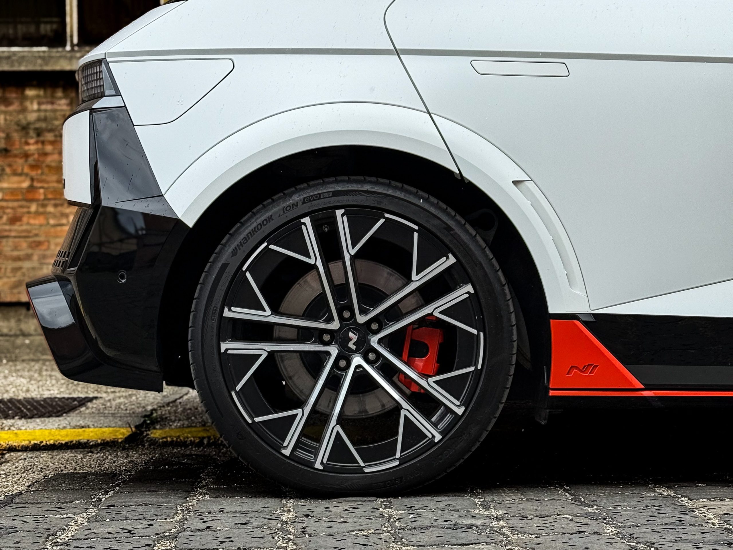 Az Ioniq 5-ös modell az 5N optikai csomagjával lett sportos és mutatós. Én nem vagyok az alapmodell külsejének nagy rajongója, ám így már nagyon tetszik. Elől-hátul új lökhárítókat kapott, hátul komoly diffúzorral, ami 4-5 cm-t lóg túl a lökhárítón. Az oldalsó küszöbök is remekül mutatnak különösen a rajtuk végigfutó lávanarancs csíkkal, ami az N logós háromszög formájú idomba végződik a hátsó kerekek előtt. Az autó szögletes küllős 21 colos felniszettje remekül kiegészíti a formavilágot, ám ennél kisebb nem is szerelhető az autóra a gigantikus első féktárcsák miatt. Megnyugtatásként azért meg kell jegyezni, hogy az állítható feszességű futómű leglágyabb (normál) módjában egészen kellemes a komfort.