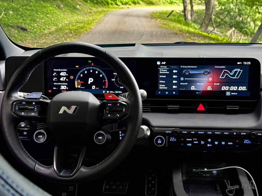 Hogy mennyire komolyan gondolták az N részlegnél a sportautó építést, nagyon jól mutatja az is, amit a szoftveres oldalon beleraktak. Kapott az autó verseny módot, amire háromféleképpen tudjuk optimalizálni az akkut: drag, azaz gyorsulás, sprint azaz rövid verseny és endurance, azaz hosszú verseny. Ezek mindegyikéhez más-más hőmérsékletre temperálja az autó az akkumulátort, hogy mindig az adott célhoz legoptimálisabban tudja leadni a teljesítményt. Kapott az autó drift optimalizálót, ami több fokozatban segít megtartani az autót driftelés közben, hogy profi módjára tudjunk íveket rajzolni egy versenypályán. De azt is be tudjuk állítani rajta, hogy az autó hajtása miként osztódjon meg az első és a hátsó tengely között. Ha akarjuk lehet fronthajtású az autó és lehet hátsókerék-hajtású is, vagy épp a kettő között tetszőleges eloszlásban. Megtaláljuk benne gyárilag a világ legfontosabb versenypályáit – köztük a Hungaroringet is – amit kiválasztva mindig tudja, hogy mikor vagyunk épp a rajtvonalnál és az alapján méri a köridőnket automatikusan. Persze, ha szeretnénk, akár új pályákat is taníthatunk neki.
