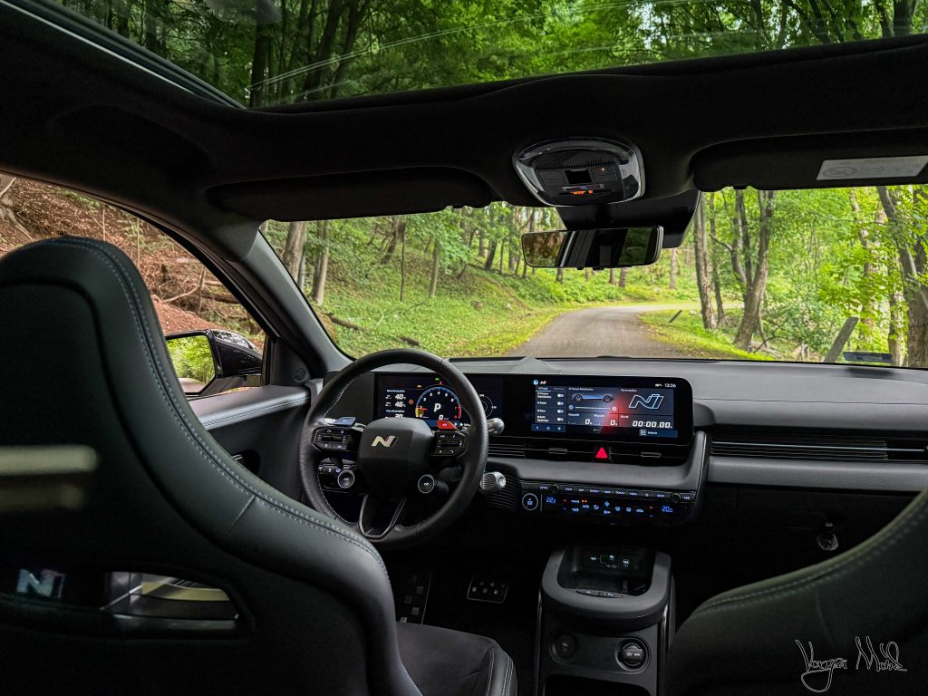 Említettem az autó váltóját, de egy picit mesélnék róla részleteiben. Amikor beindítjuk az autót, hagyományos módban indul, mint bármely elektromos autó, csak D-be rakjuk és indulunk, lineárisan gyorsulunk. Ám, ha megnyomjuk a kormányon a jobb oldali „N” feliratú gombot, hirtelen megjön a motorhang és megjelenik a műszerfal közepén egy nagy fordulatszámmérő. Az így aktivált virtuális váltónak pedig úgy programozták le a működését, ami tökéletesen megfelel egy átlagos sportautó automata váltójának. Ha „normal” módban vagyunk, korán felváltogat (50-nél kb. 5. fokozatba), alacsonyan tartja a fordulatot és kicsit ügyetlenkedik egy nagyobb gázra. „Sport” módban visszavált egyet, magasabbra kerül a fordulat, élesebb gázreakció ésfeszesebb futómű jellemzi. „N” módban viszont 50-nél már 3-asban vagyunk (néha 2-esben), a futómű igazán feszes lesz, a gázpedál roppant éles és minden lábrezdülésünkre ugrik az autó. Ha ilyenkor elindulunk kb. 30%-os gázzal, szépen 3000 körüli fordulatnál váltogat fel és közben ropog a virtuális kipufogó mögöttünk – hisz ugye a hang is megérkezett a váltóval. Lassításoknál kis gázfröccsel vált vissza az autó, mint egy becsületes sportos váltó, ha pedig nagyobb tempóról, dinamikusan lassítunk, akkor a váltásoknál ropog is a virtuális kipufogó. Amikor kézzel váltogatunk – a kormány mögötti fülekkel – ismét egy igazi váltó karakterével találkozunk: 50-nél, 6. fokozatban padló gázra alig indul meg az autó, pont úgy, mint egy belső égésű autó esetén, hisz messze van a nyomatékcsúcs. Amint pedig visszaváltunk, máris a kirobban az autó ereje. Amikor egy fokozatban leforgatjuk leszabályzásig – mert, hogy van ilyen is – akkor 8000 körüli fordulatszámnál ugrál a mutató és megtorpan az autó addig, amíg be nem húzzuk a következő fokozatot, ami egyből keményen hátba vág. Padlóig taposott gázzal gyorsítva minden váltásnál hátba vág az autó – ahogy sok sportautó is teszi. Teljesen beteg, teljesen fanatikus gondolkodást, odafigyelést és gondosságot mutat ez a fejlesztőktől.