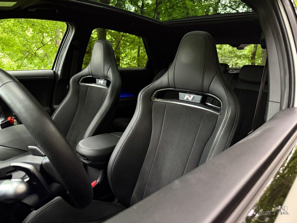 Az 5N belsőterei picit mások a hagyományos Ioniq 5-höz képest. Ami elsőre feltűnt, hogy az utastérben több a finom, puha felület, mint az Ioniq 5-nél. De szembetűnő különbség a középkonzolnál, a műszerfal alatti tároló is. Az 5N esetén sokkal előrébb tolták ezt a boxot és magasabbra emelték úgy, hogy közben ki is párnázták az oldalát. Ez pedig igen kényelmesen támasztja meg így a sofőr és az utas lábát a tempós kanyarokban. Erről a boxról nekem kicsit hiányoztak a fizikai gombok az ülések fűtésére és szellőztetésére, ami a sima Ioniq 5-ben megtalálható, de ez csak apróság.