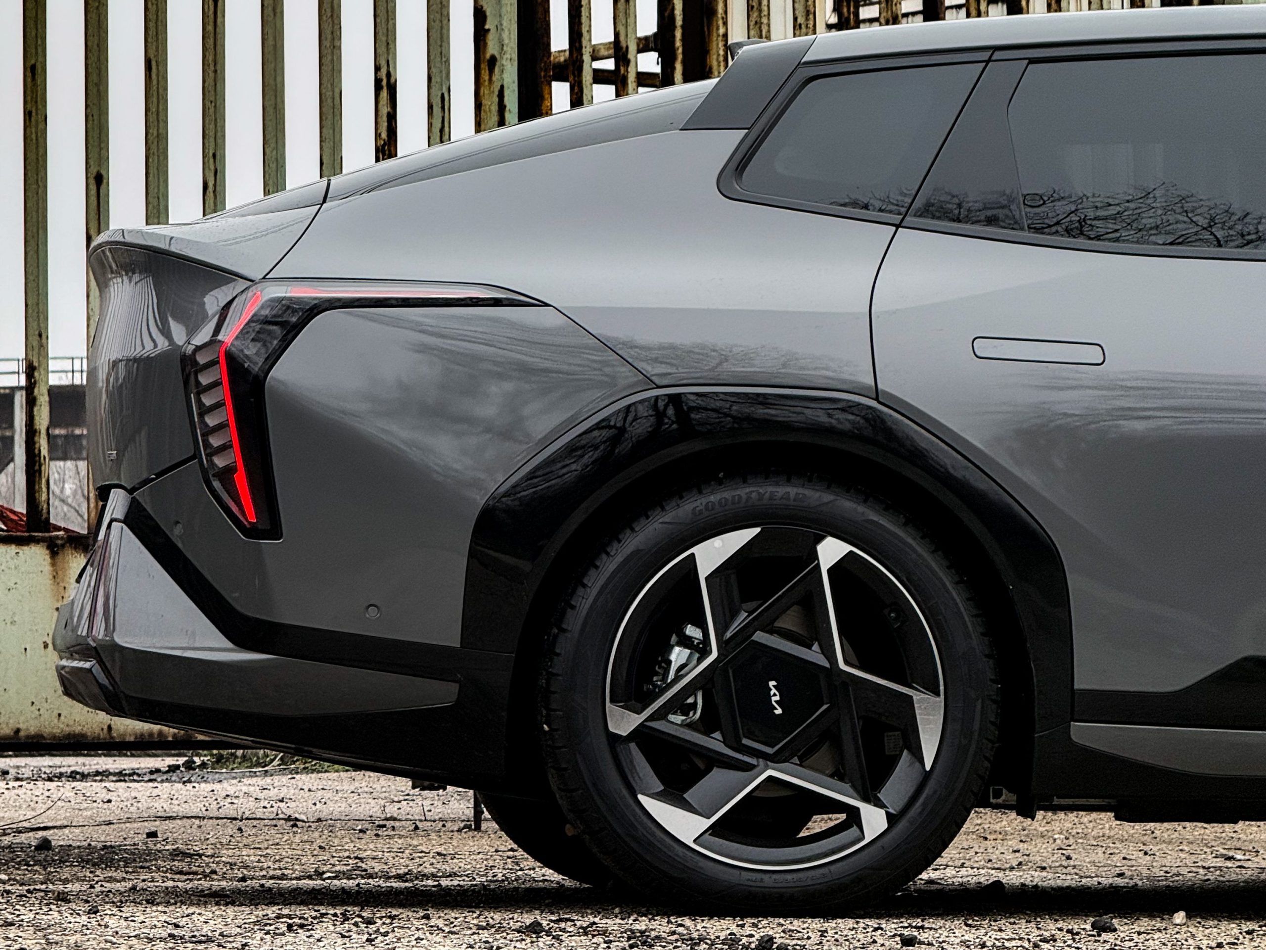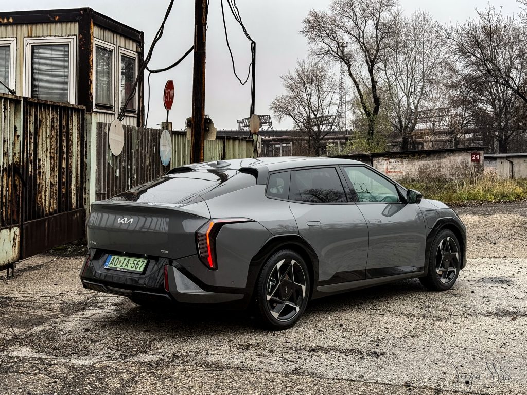2025. elején az EV3-ra azt írtam, hogy úgy néz ki, mintha egy katanával faragták volna a formát és az az igazság, hogy az EV4 Fastback-re ez még igazabb. Egészen meglepően szögletes, rendkívül sok sima, egyenes felülettel igyekszik besimulni a Kia palettájába. Már az autó elején a lökhárítót és a „motorháztetőt” is 45 fokban kötötték össze egy egyenes vonallal, mintha lefózolta volna ott egy óriás az autó orrát. Az autó középső traktusa egészen kellemes vonalvezetéssel halad hátrafelé, majd eljutunk az ismét meglepő farrészhez: egy hosszan elnyúló, szedános hatású, ám kb. 20-30 fokban ereszkedő hátsórészhez. A szemünk azonban akkor nyílik igazán kerekre, amikor megnyomjuk a csomagtérnyitó gombot: az ugyanis épp csak az autó leghátulján nyit ki egy lőrésnyi ajtót. Egy átlagos konyhaszéket is esélytelenek vagyunk oda betenni, na de nem azért, mert nem lenne elég tágas – kifejezetten jó térkínálata van a 490 literes űrtartalommal. A képzeletbeli konyhaszék útját a rendkívül szűk a nyílás akadályozza. Akár nyílhatna az egész hátsó szélvédő is, hisz úgy lenne egy kiválóan hozzáférhető csomagterünk, de valamiért ezt nem így gondolták a mérnökök. A fiaim nagy jégkorongos táskái meglepő könnyedséggel fértek el benne, ugyanakkor a belső végébe begurult kulacsot már komoly tornamutatvány volt kivadászni ebben a téli, sáros időben lekoszolódott lökhárító felett derékig behajolva. A design összkép szokatlanságát tovább fokozzák az álló csíkban megformálódó első-hátsó lámpák. Idővel lehet, hogy megszokjuk őket, de elsőre meglepőek. Feleségem például, míg az első napon kifejezetten nem kedvelte a formát, néhány nap után már kifejezetten kedvelte. Ki tudja? Talán csak nem elég kifinomult még az ízlésünk a design megértéséhez? 😊