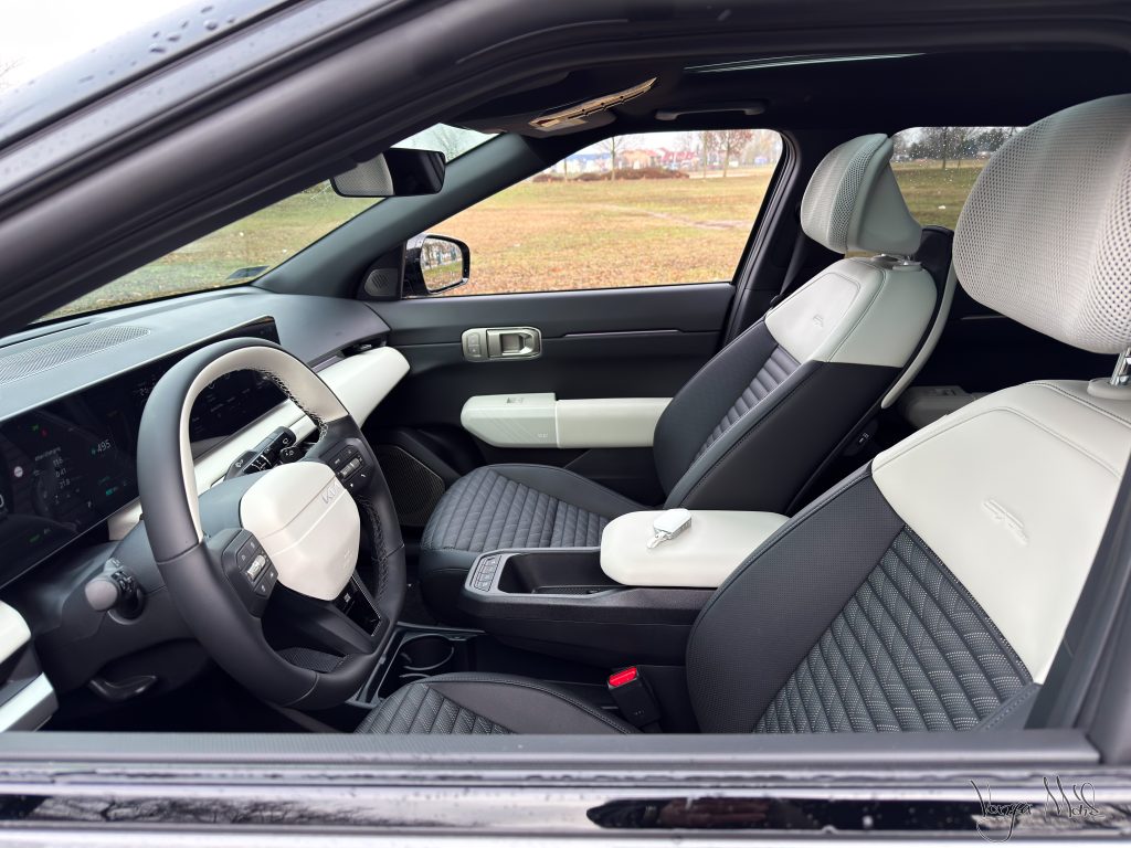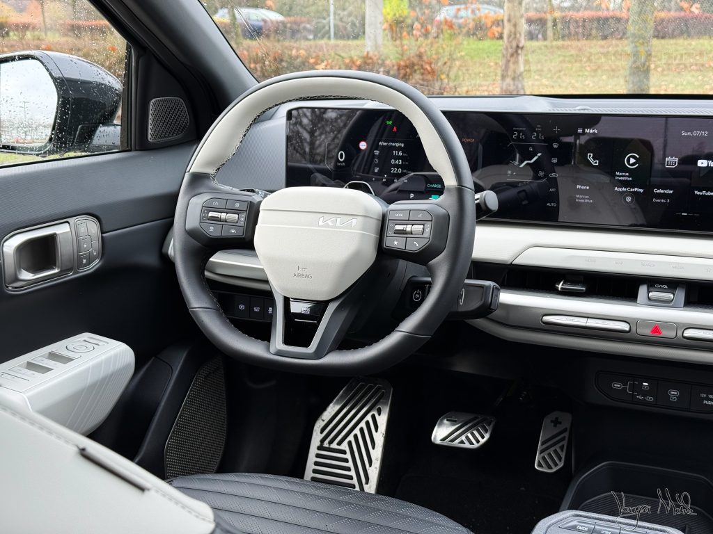 A második, ami meglepő volt, hogy az ülései is kényelmesebbek, mint a Kia EV6-ban. Határozottan komfortos, kellemes üléseket kapott az EV4 és a GT-line felszereltség szellőztetett szintetikus fekete-bézs vegánbőr ülései jól is mutatnak. A harmadik pedig a fejtámla. Igen, a fejtámla. Miért érdekes ennyire? Mert a Mercedes S osztály extra komfort párnával ellátott fejtámlái kényelmesek annyire, mint amit az EV4 első ülései kaptak. Napokig meglepődtem, amikor hozzáért a fejem, hogy úúúú, ez de jó! Légies, könnyed érzés, ami finoman támasztja meg a fejünket.